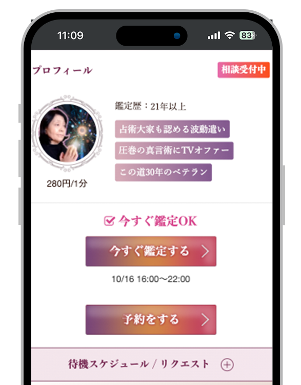 気になる占い師を選んだら、ページ内の「今すぐ鑑定する」または「予約をする」ボタンをタップ。