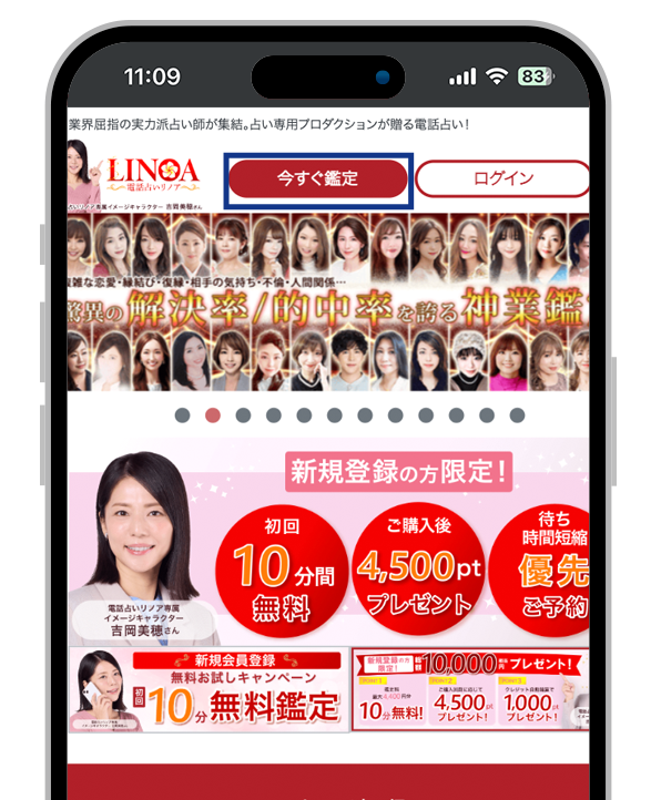 まずは、電話占いリノアの公式サイトにアクセスし、「今すぐ鑑定」ボタンをタップ。