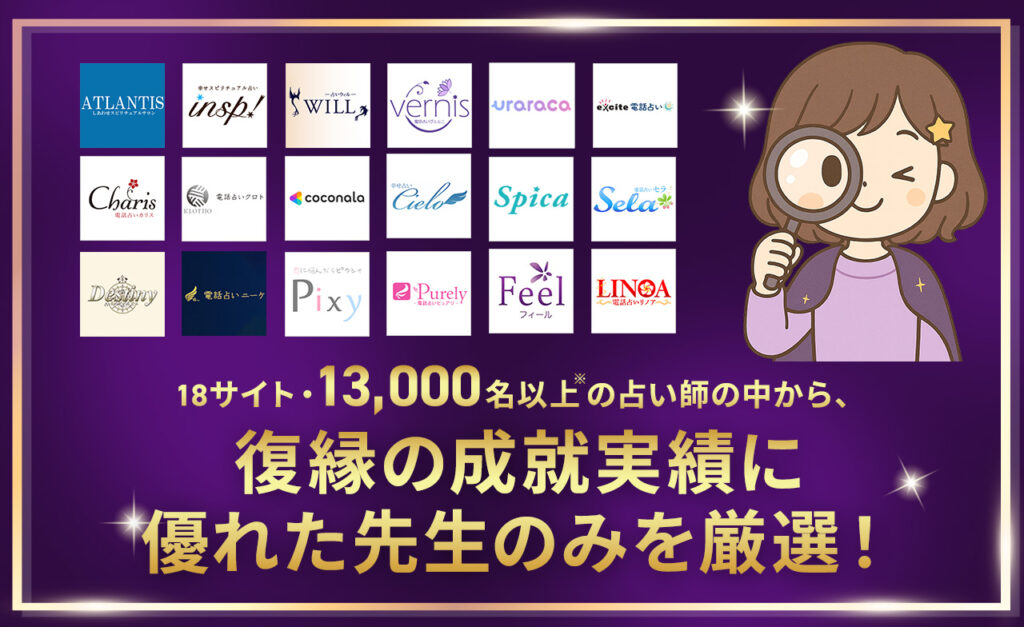 今回ご紹介する占い師は、電話占いラボが紹介する18サイト・13,000名以上※の占い師の中から、復縁の成就実績に優れた先生のみを厳選しています。