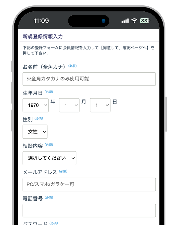 生年月日やニックネーム、電話番号などの基本情報を入力し、電話番号認証を行うことですぐに登録が完了します。