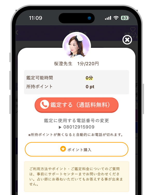 「電話」ボタンをタップし、鑑定するボタンをタップすると占い開始です。